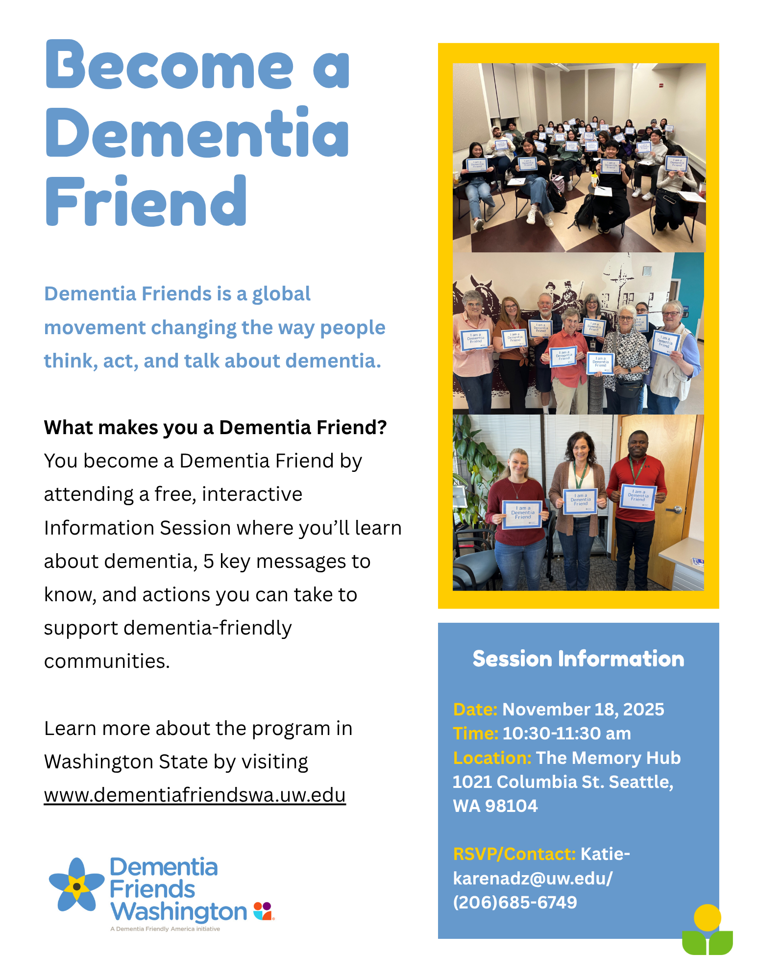 Tuesday, November 18, 2025 at 10:30am You become a Dementia Friend by attending a free, interactive Information Session where you'll learn about dementia, five key messages to know, and actions you can take to support dementia-friendly communities.